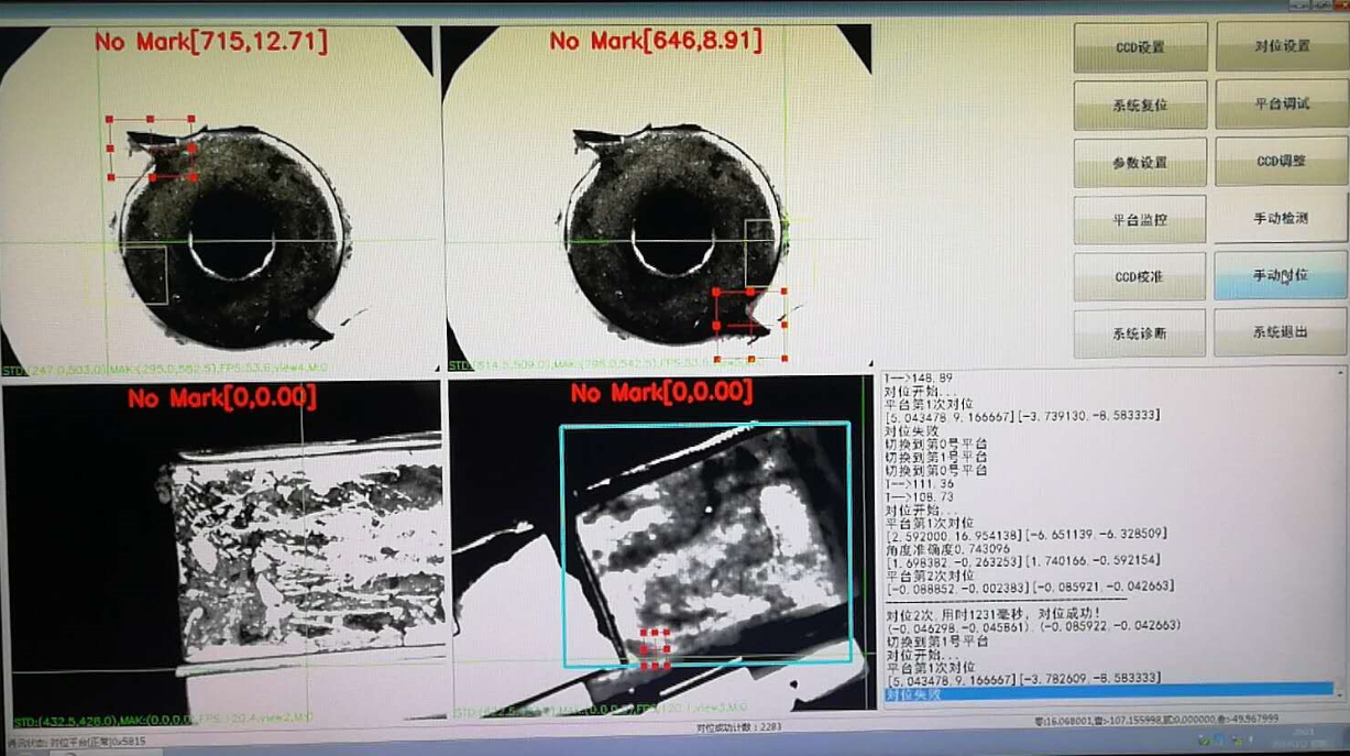 針對上述問題四元數研發了全自動組裝線軟件,整套軟件由兩套視覺對位軟件以及兩套視覺檢測軟件復合而成,在一個界面完成操作,兩套視覺檢測軟件分別用于檢測兩組刀片用于區分正反面,兩套對位軟件分別進行兩組刀片的對位,在不影響生產效率的同時又極大地節省用戶的硬件成本。
